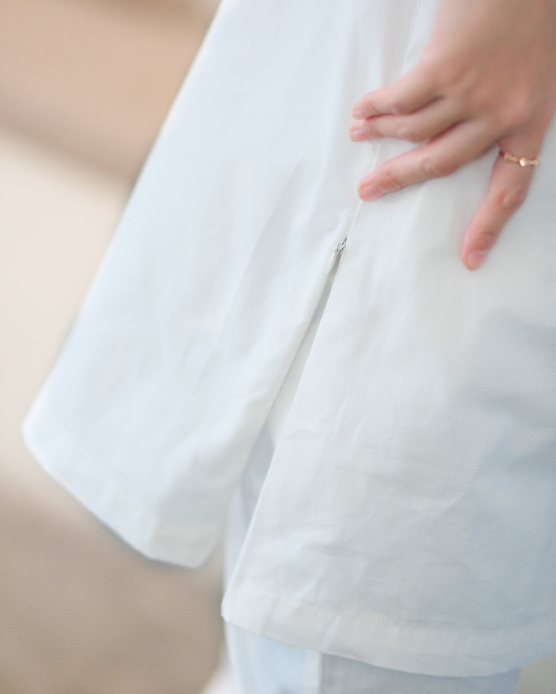 Crafted from premium cotton poplin, the Adhia Set offers a luxurious feel and exceptional comfort. The statement sleeves add a touch of drama and elegance, making heads turn wherever you go. With its button back neck detail, this set effortlessly combines contemporary design with timeless charm.