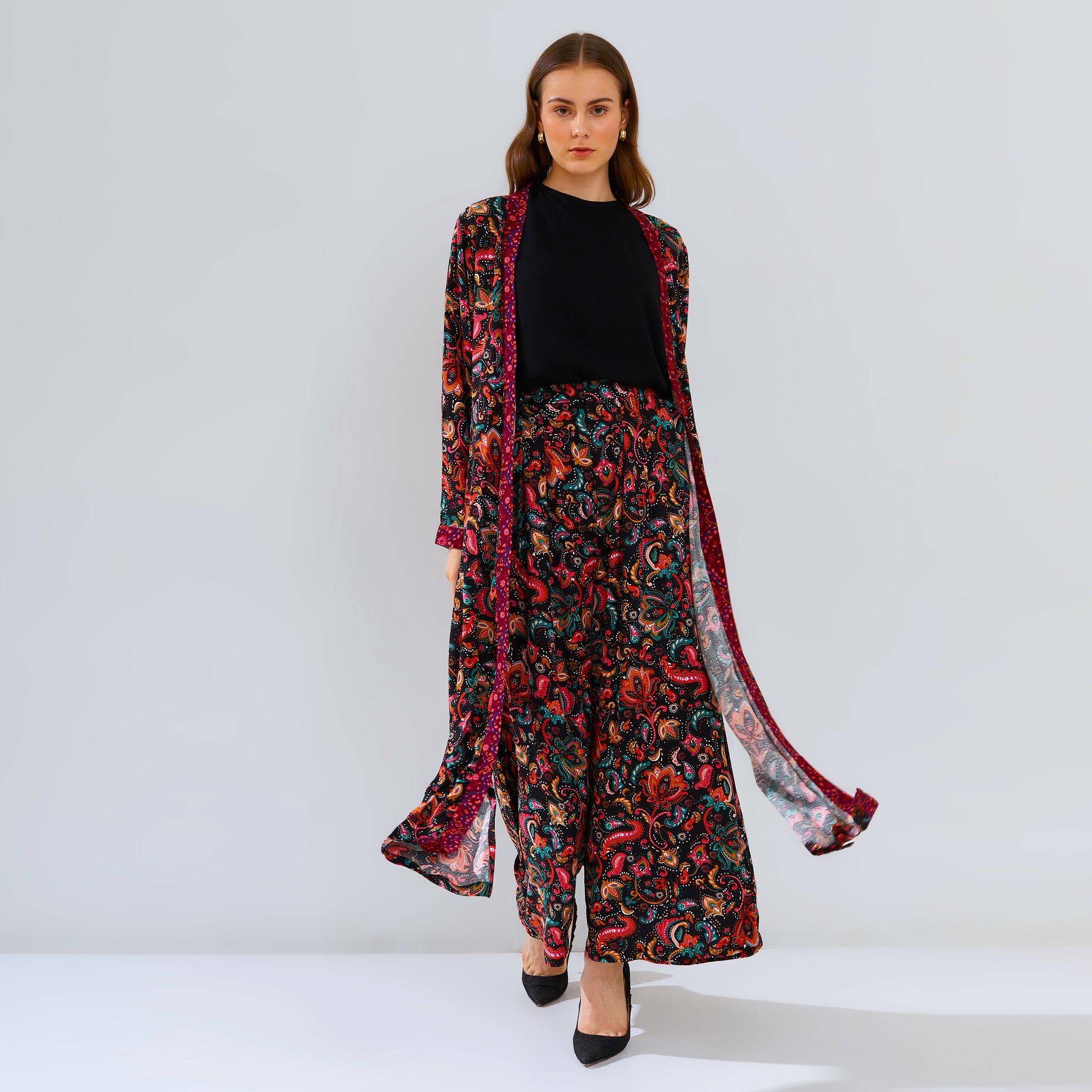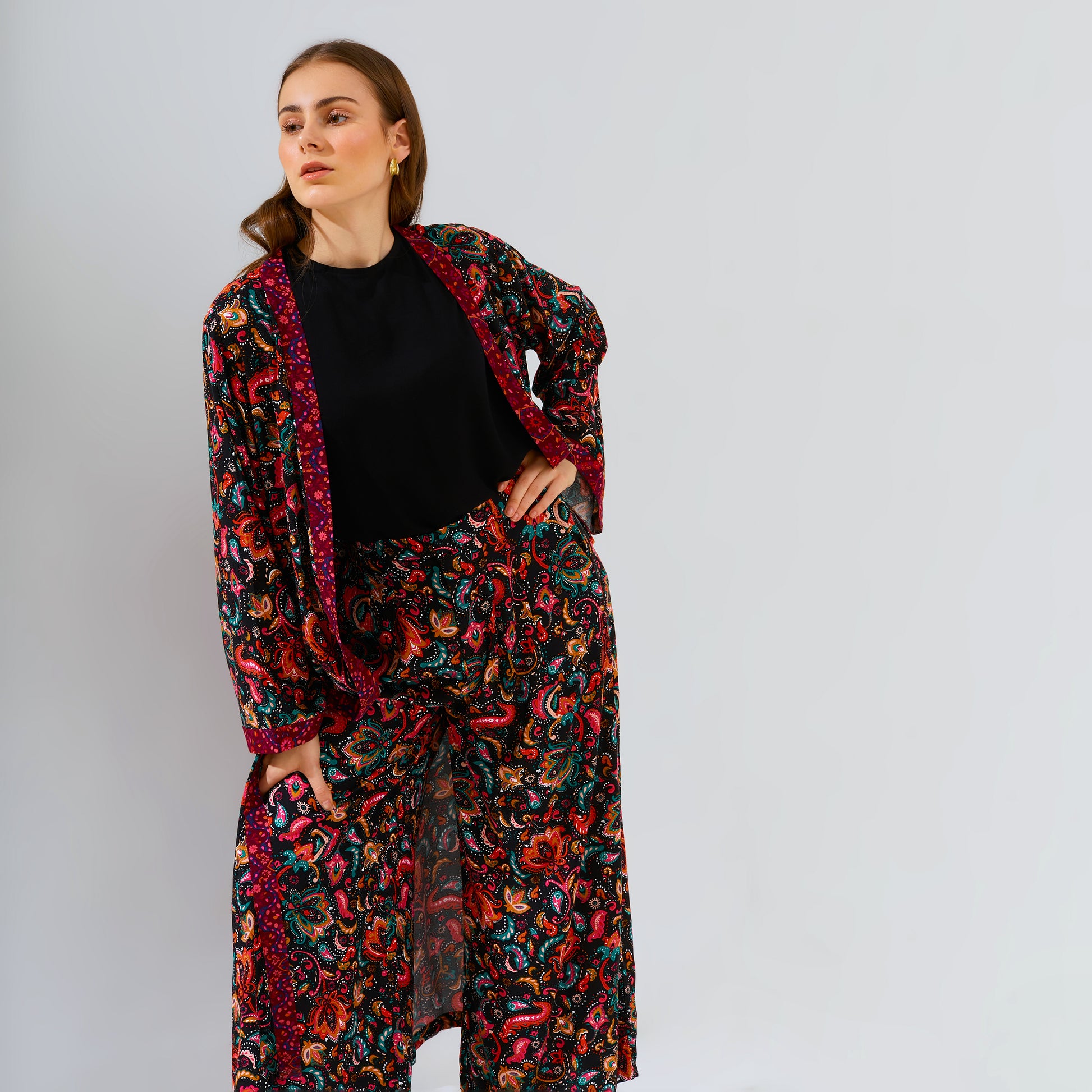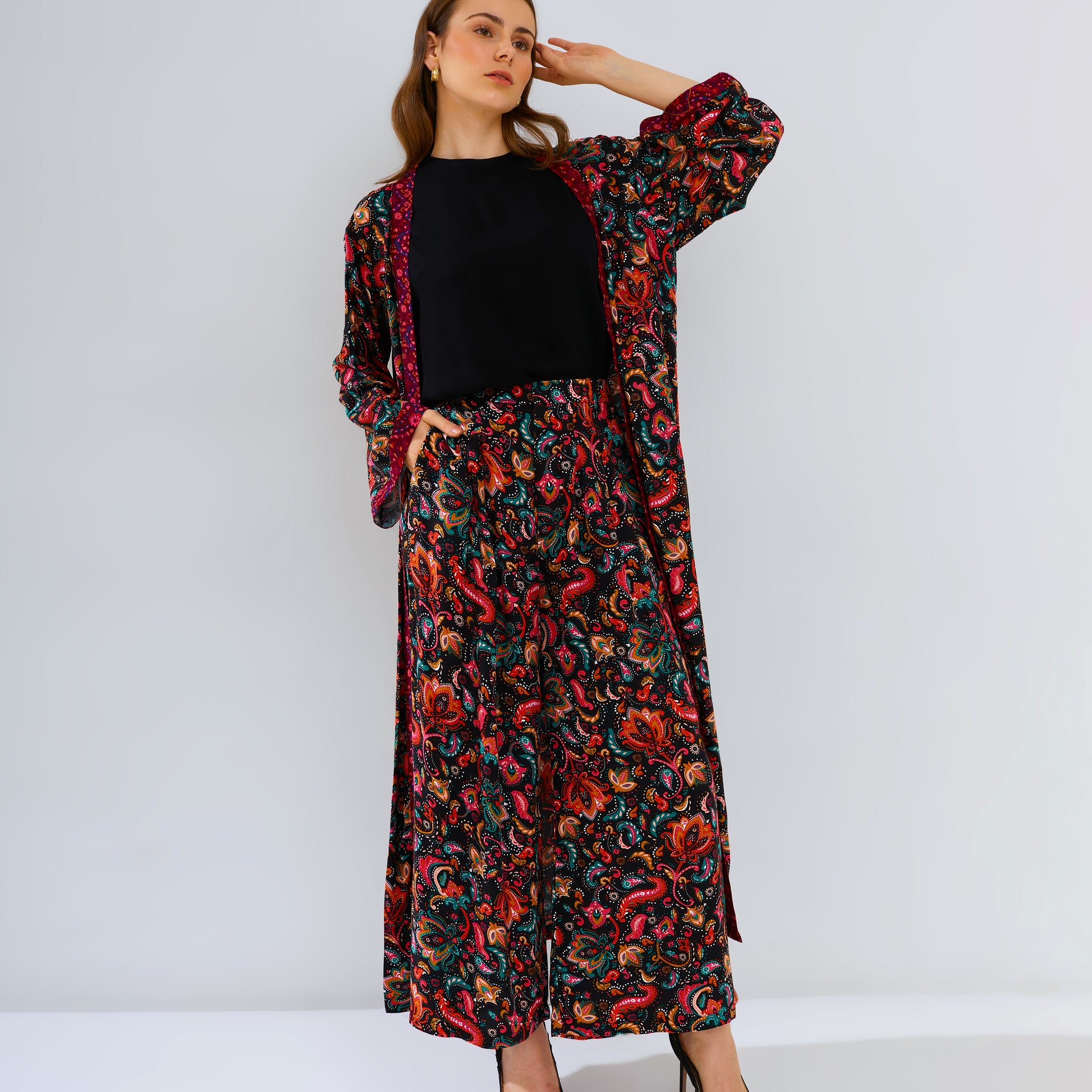Introduce your wardrobe to Amaya Black, the perfect combination of comfort, style and quality. Crafted with an eye-catching motif print and combining a culotte pant with an outer layer - it's easy to stand out with this unique and limited design. Feel gorgeous, casual and cool with Amaya Black.