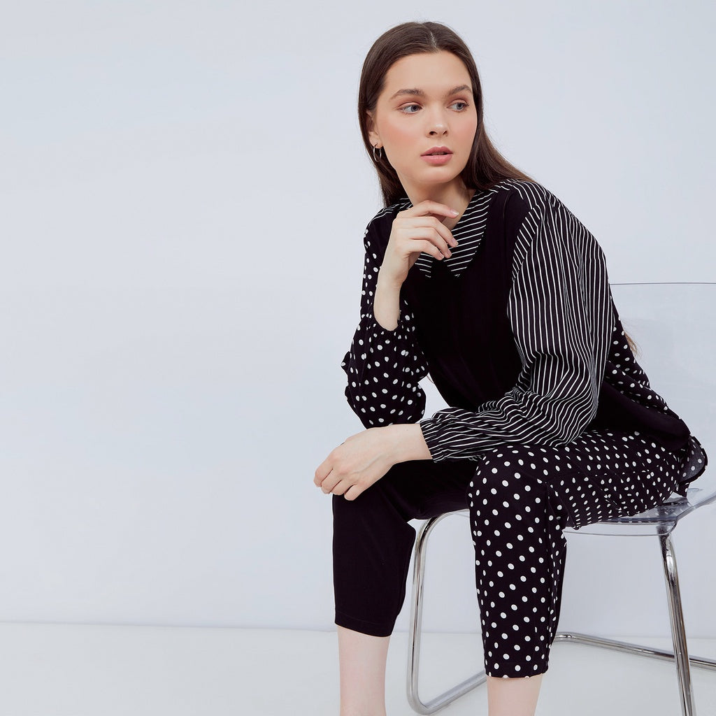 Bechara Black Long Set (long sleeve top n long pants) n Get Free Scrunchie 2 pcs. Warna hitam pada bagian depan,lalu di combine dengan motif stripes&Polkadot yg unik.Kombinasi warna senada ini bisa membuat kmu terlihat gorgeous kapanpun!!juga ada tambahan pocket dibagian kanan dan kiri celana!! bahan yg digunakan rayon twill dan katun jepang yg nyaman dan adem untuk semua jenis kulit!!