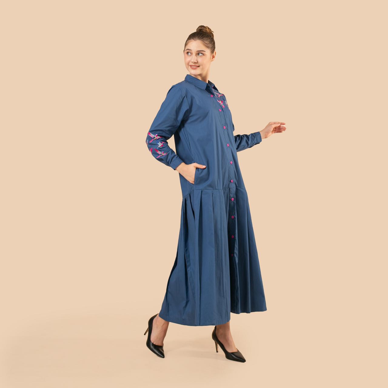 Elevate your style with the 'Neo Hummy Dress Blue'! This women's dress is crafted from premium poplin cotton, ensuring maximum comfort. Its chic design is not only stylish but also mesmerizing, featuring beautiful and colorful hummingbird embroidery details on the chest. Embrace elegance and beauty with every step in this dress