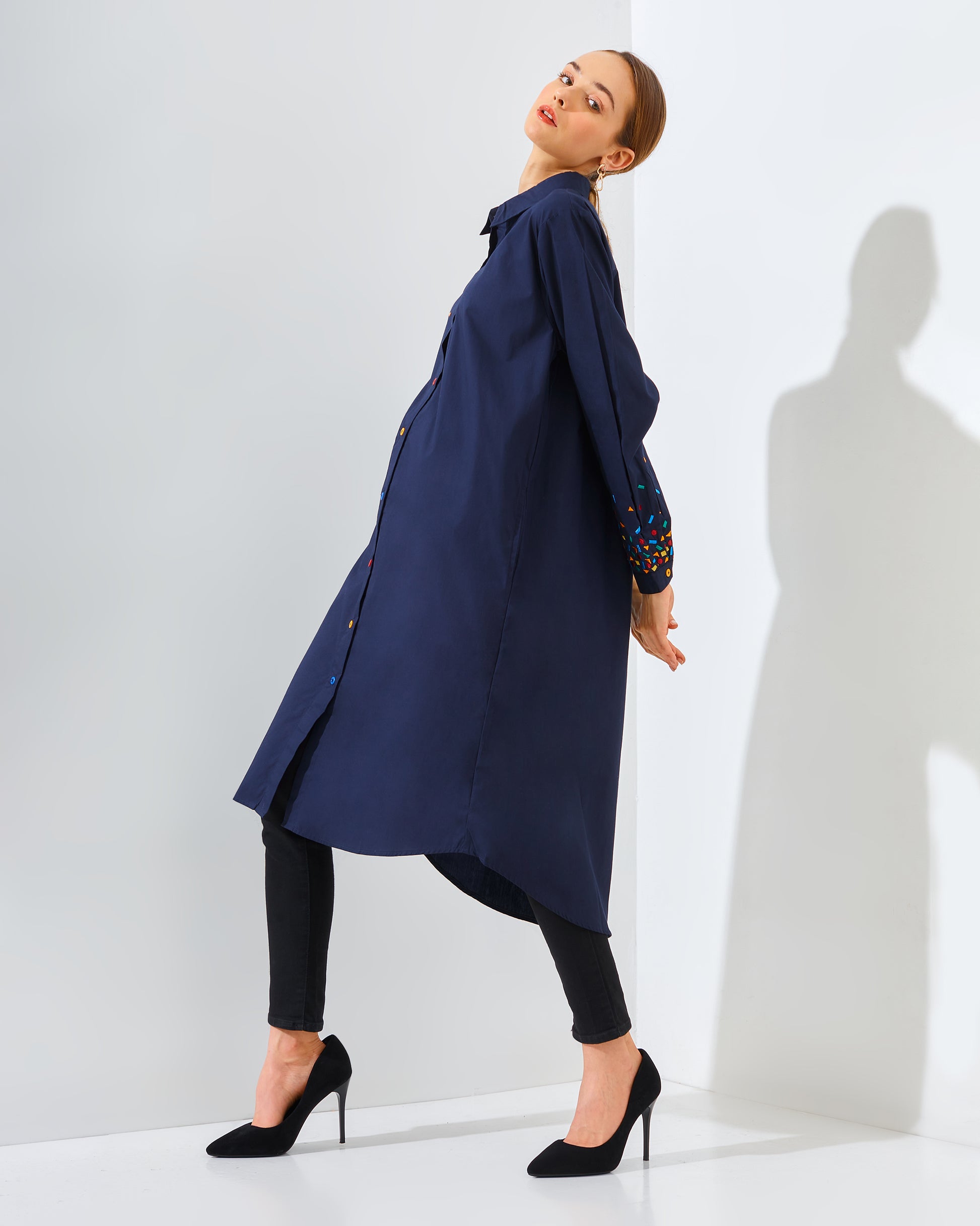 Introducing the Mille Embro Tunic Navy - crafted from premium poplin, adorned with intricate embroidery details, and part of the exclusive collection. Feel luxurious in this high-quality tunic and be a head-turner in any occasion!