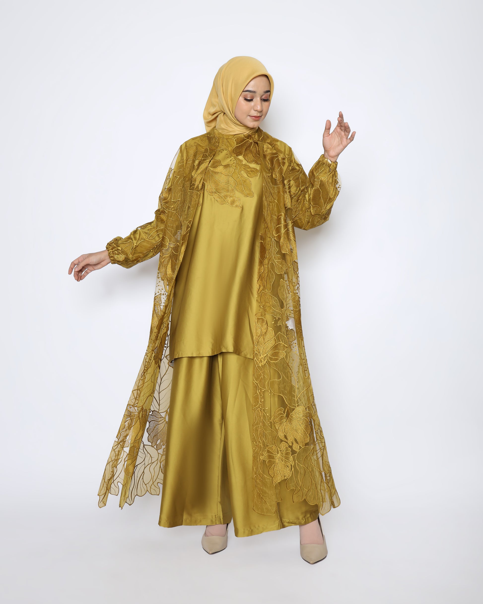 Each set consists of three pieces: outer, inner, and pants. The outer is made of premium organdy luxury material with beautiful leaf motifs. The inner uses soft sateen silk material with motif details on the chest. The pants are designed for a balance between style and comfort.