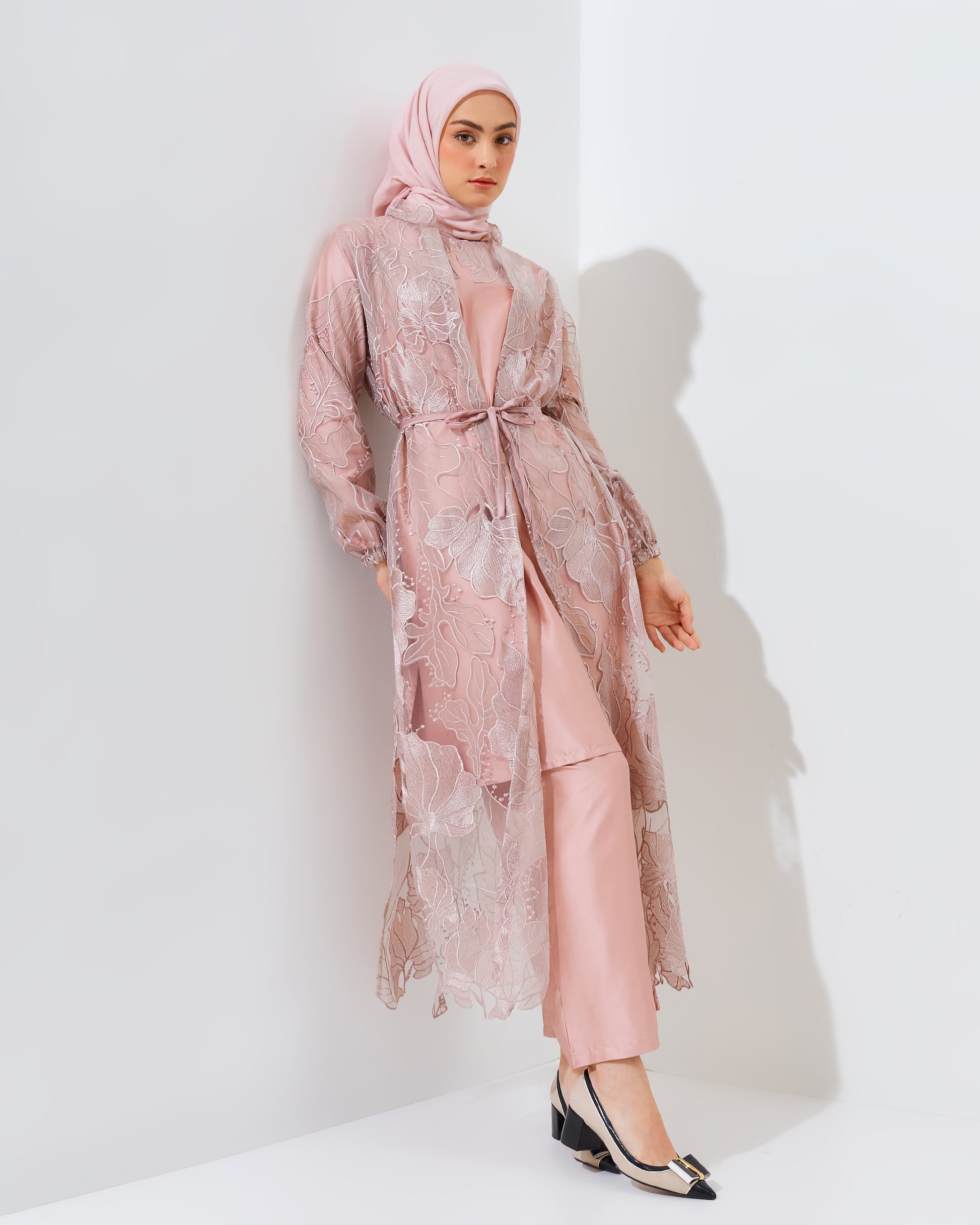 Each set consists of three pieces: outer, inner, and pants. The outer is made of premium organdy luxury material with beautiful leaf motifs. The inner uses soft sateen silk material with motif details on the chest. The pants are designed for a balance between style and comfort.