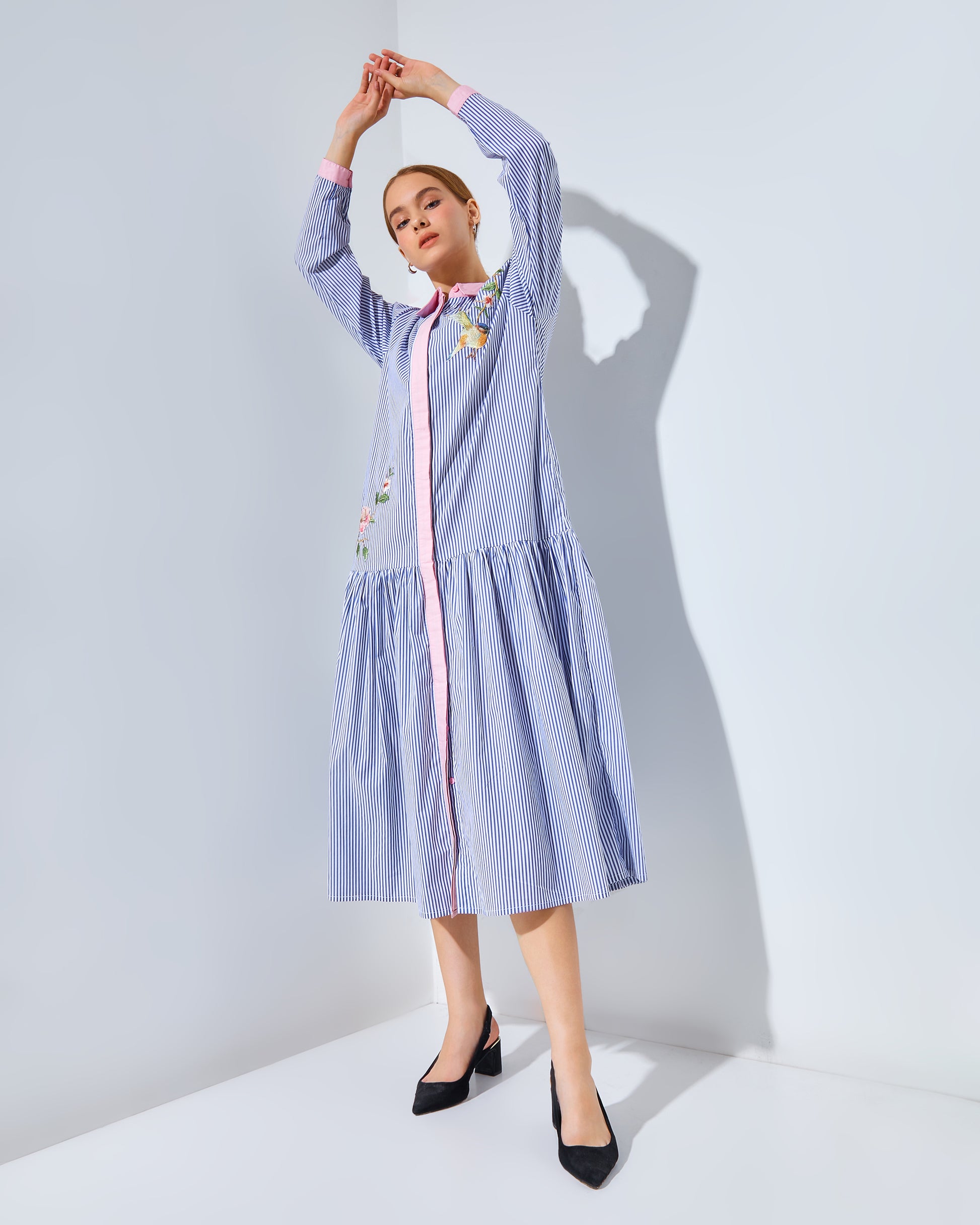 Introducing the "Rachell Dress Striped Blue," a stunning dress that perfectly combines elegance and stylishness. This dress showcases an elegant design of Blue and white stripes with captivating floral accents. Made from premium Japanese cotton Stretch, this dress offers unmatched comfort and luxury. Embrace charm and grace with the meticulously designed Rachell Blue Striped dress, crafted to enhance your natural beauty. Make a captivating fashion statement with the Rachell Dress Blue Striped and enjoy an unforgettable look.