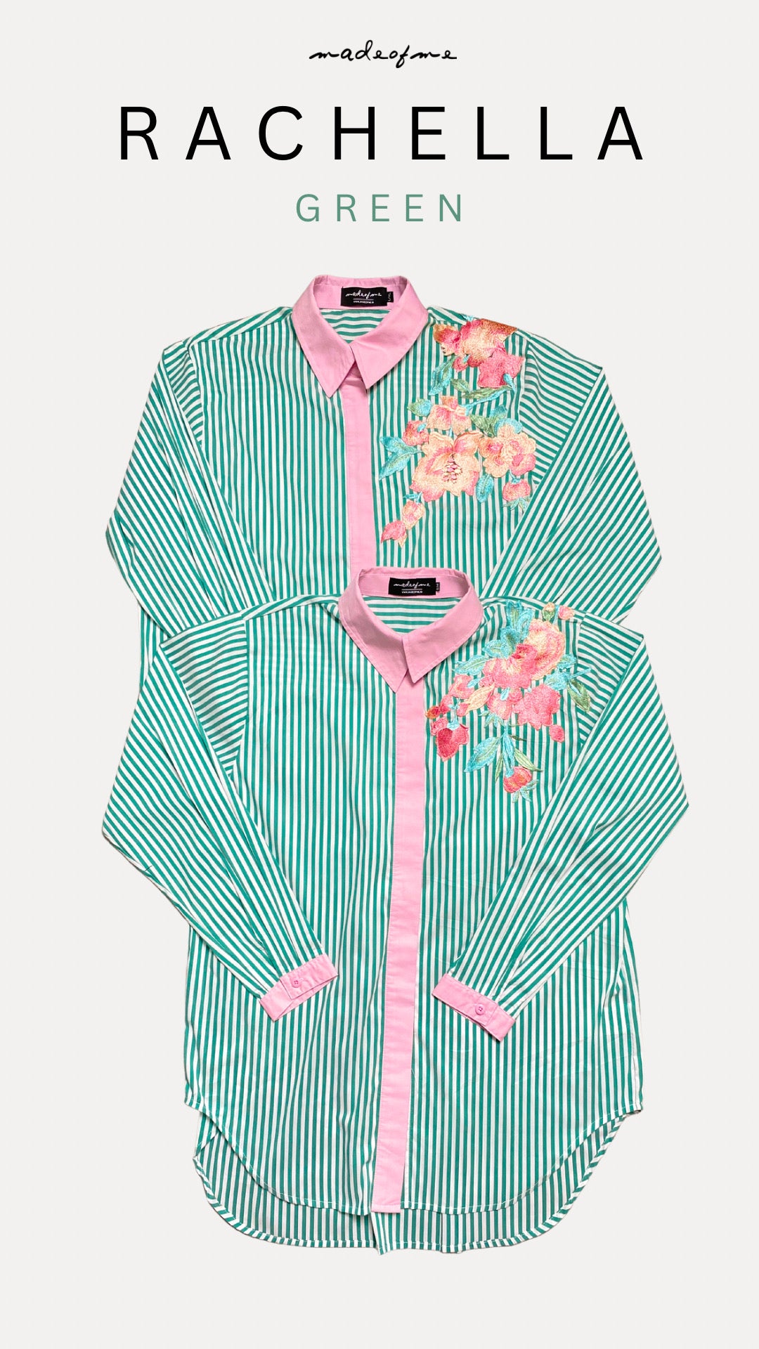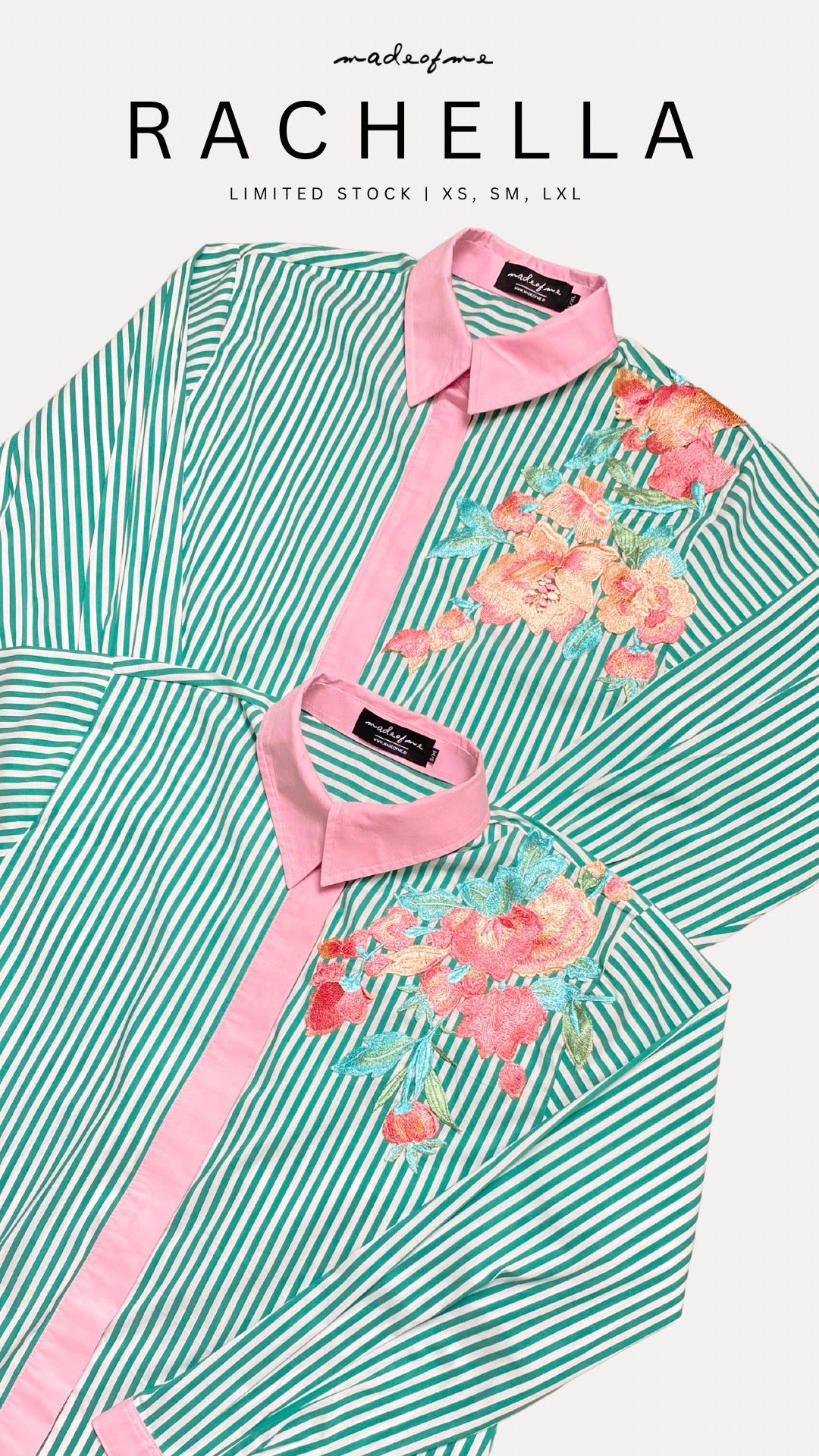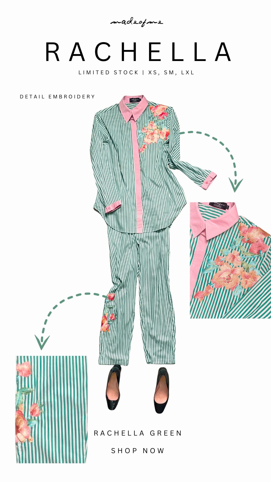 Designed with meticulous care, Rachella Green menampilkan desain motif garis-garis yang memberikan sentuhan tampilan segar dan modern. Namun, yang membuatnya benar-benar spesial adalah aksen bunga-bunga cantik yang dipercantik dengan teliti di bagian depan baju, memberikan nuansa feminin dan elegan yang tak terlupakan.