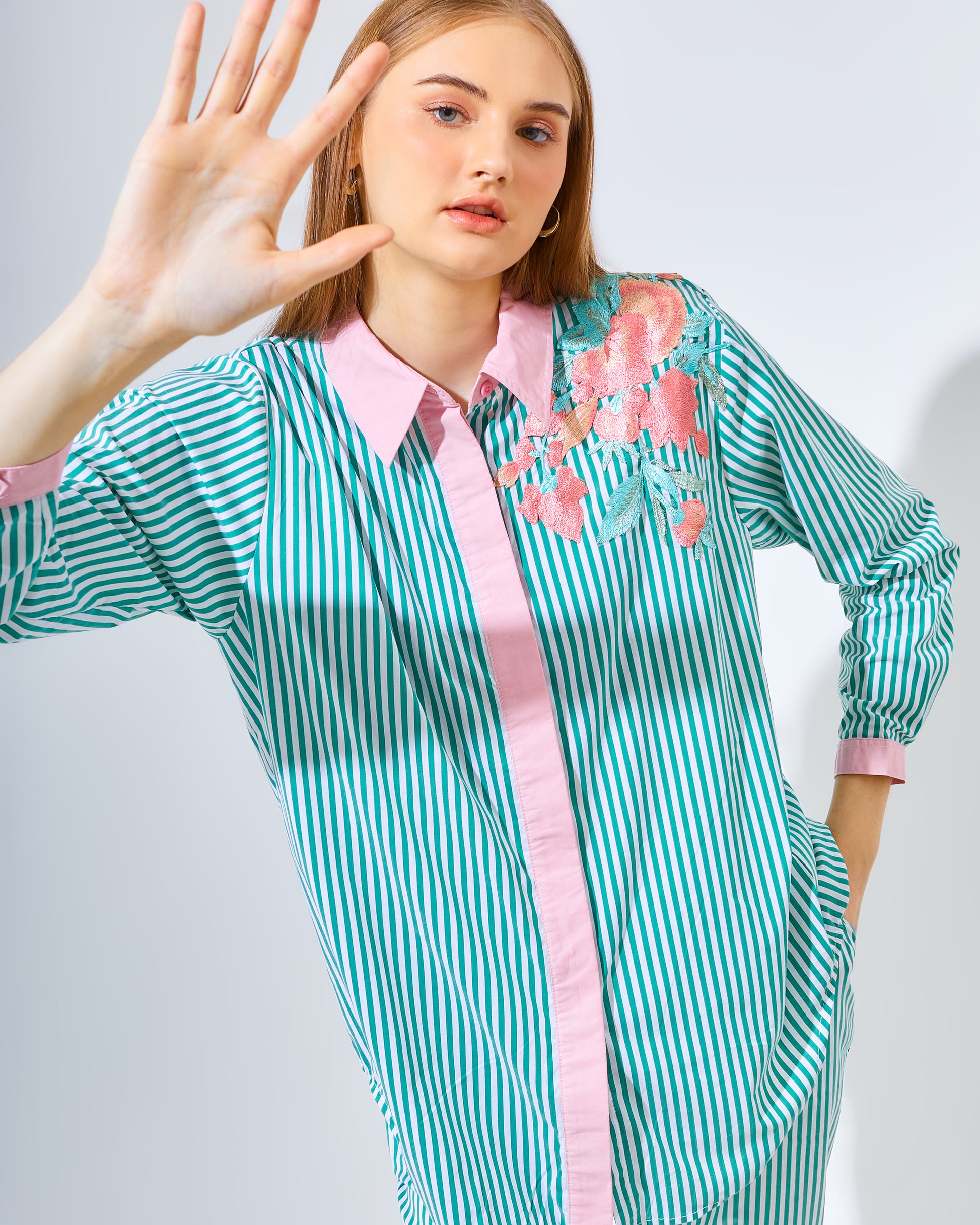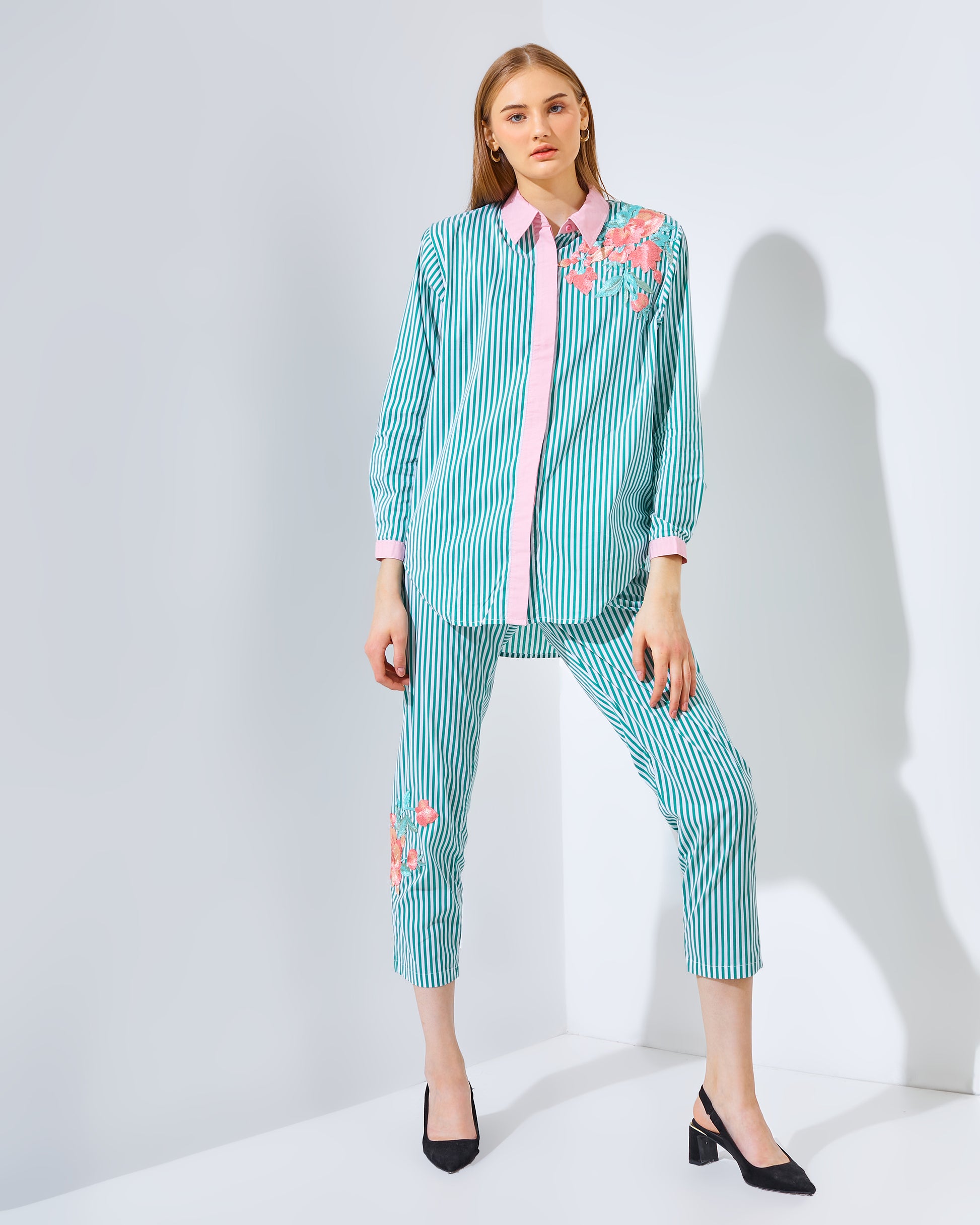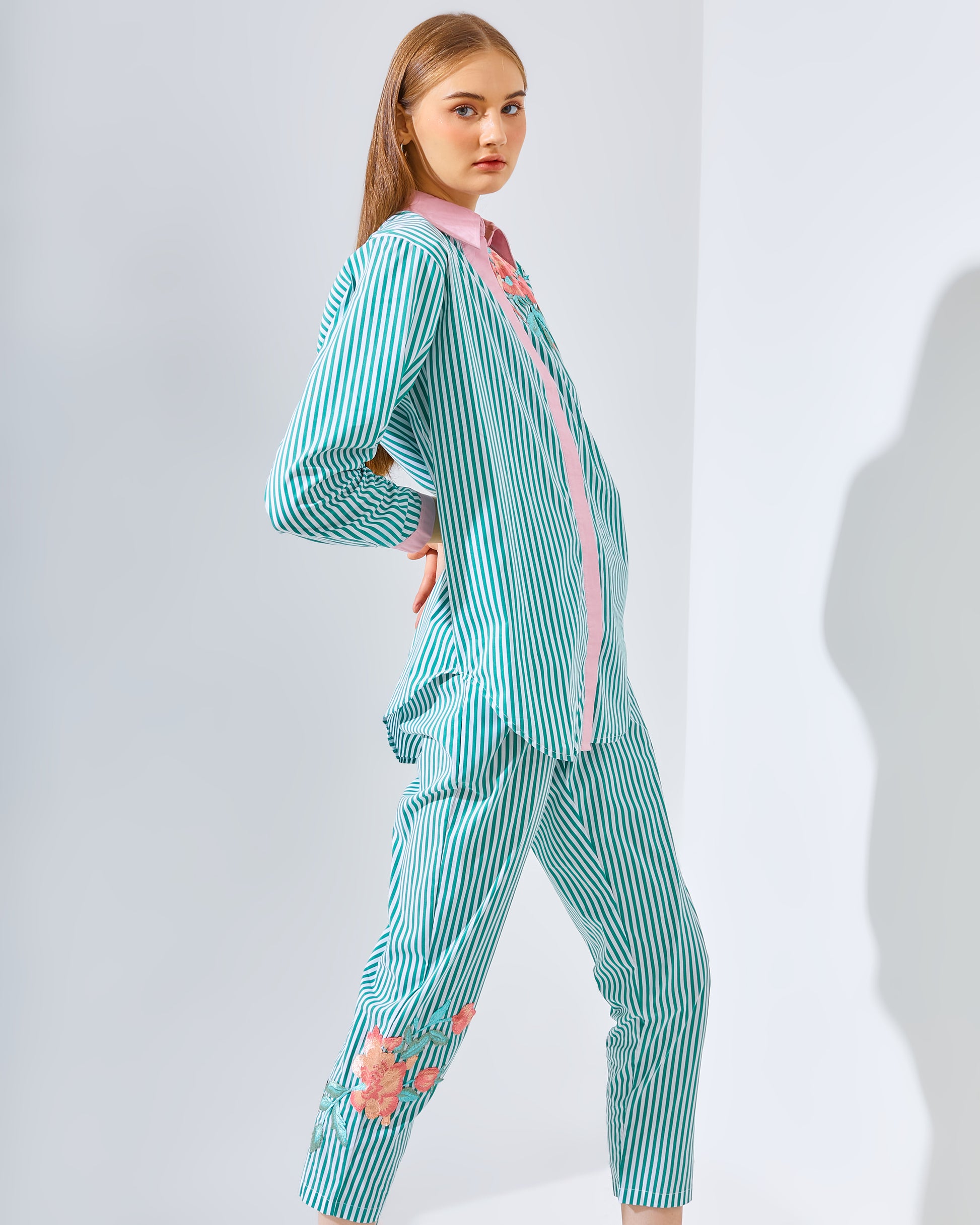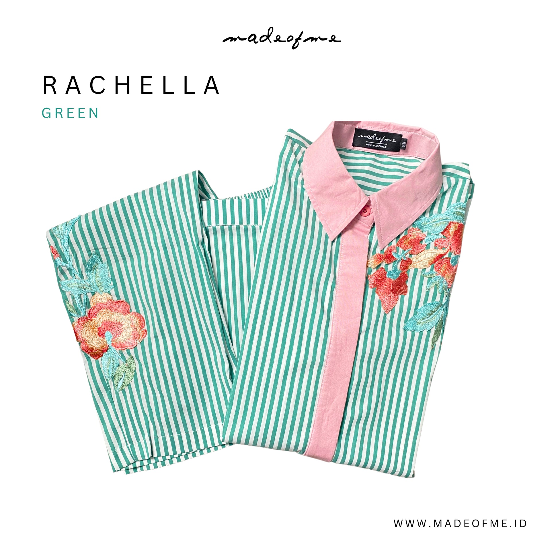 Designed with meticulous care, Rachella Green menampilkan desain motif garis-garis yang memberikan sentuhan tampilan segar dan modern. Namun, yang membuatnya benar-benar spesial adalah aksen bunga-bunga cantik yang dipercantik dengan teliti di bagian depan baju, memberikan nuansa feminin dan elegan yang tak terlupakan.