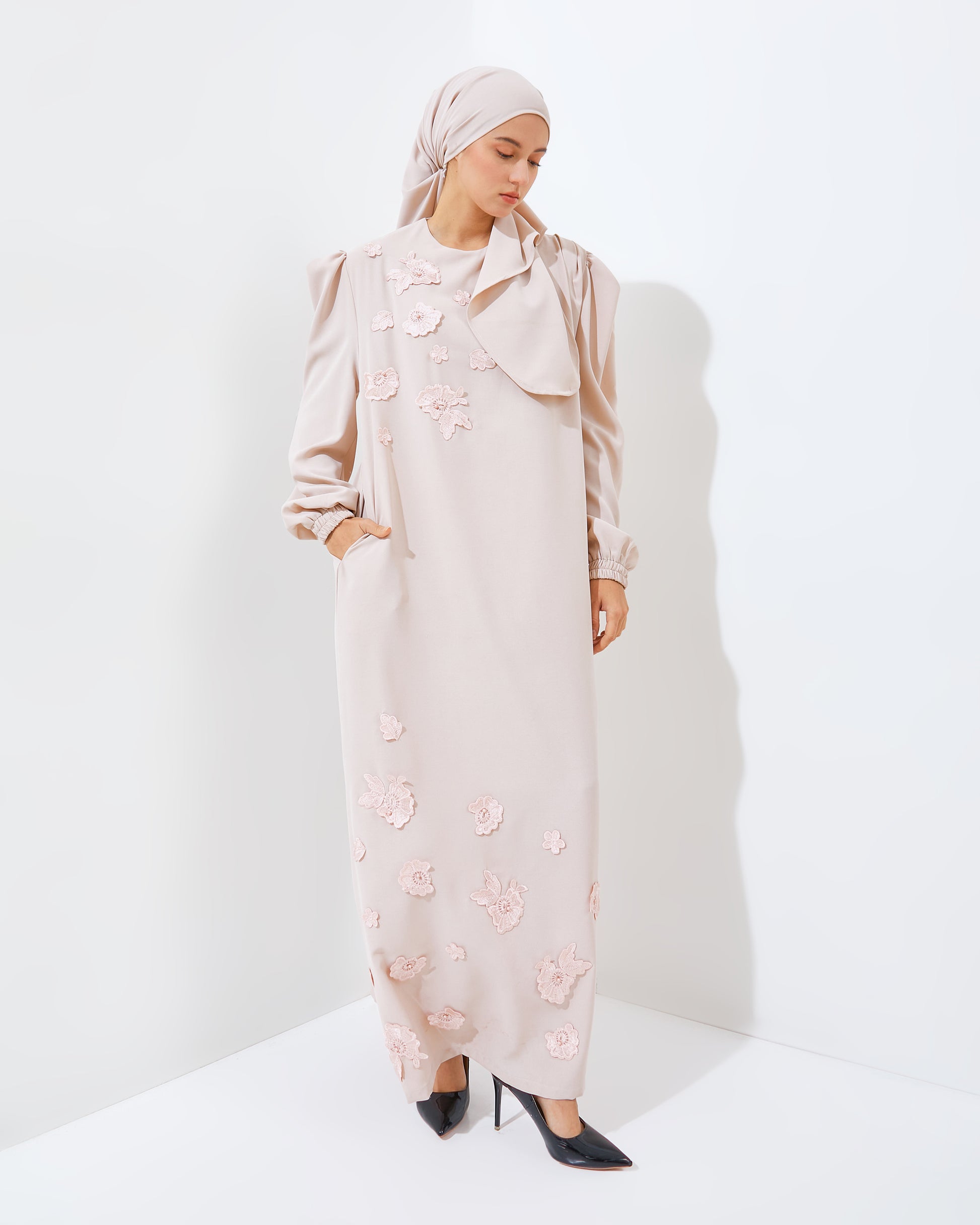 Meet Raddiya Rayya, crafted from lightweight synthetic cotton that feels breathable, soft, and beautifully flowy. Designed for Hari Raya moments with your loved ones, this piece blends comfort with elegance.