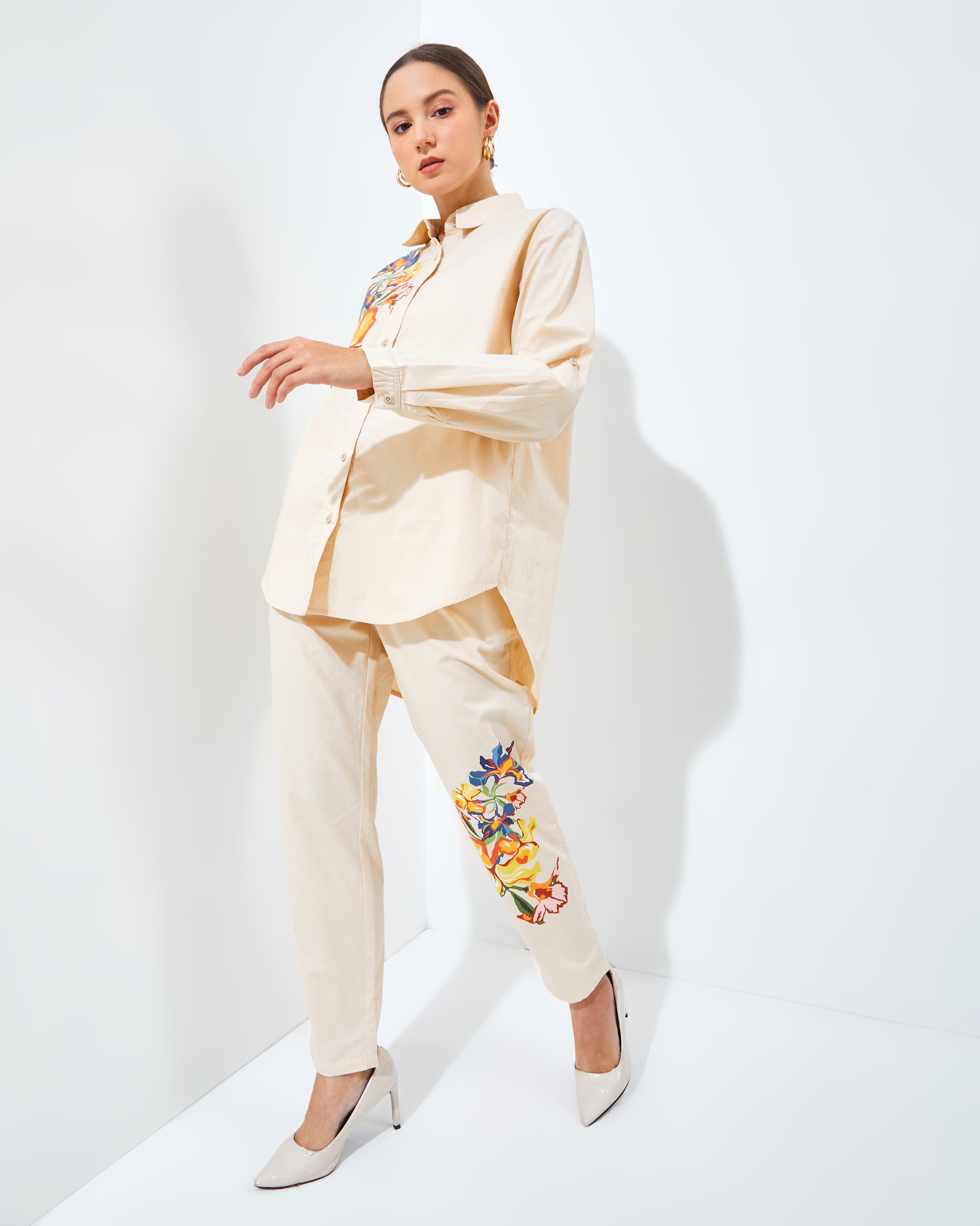 Crafted from a premium cotton blend, the Terre Matching Set offers a perfect balance of style and comfort. The button-down top features delicate floral patterns that add a burst of vibrant color, while the straight-cut pants ensure a sleek, flattering silhouette. Whether you prefer the timeless elegance of black or the fresh, crisp look of white, this set is designed to bring versatility and charm to your wardrobe.
