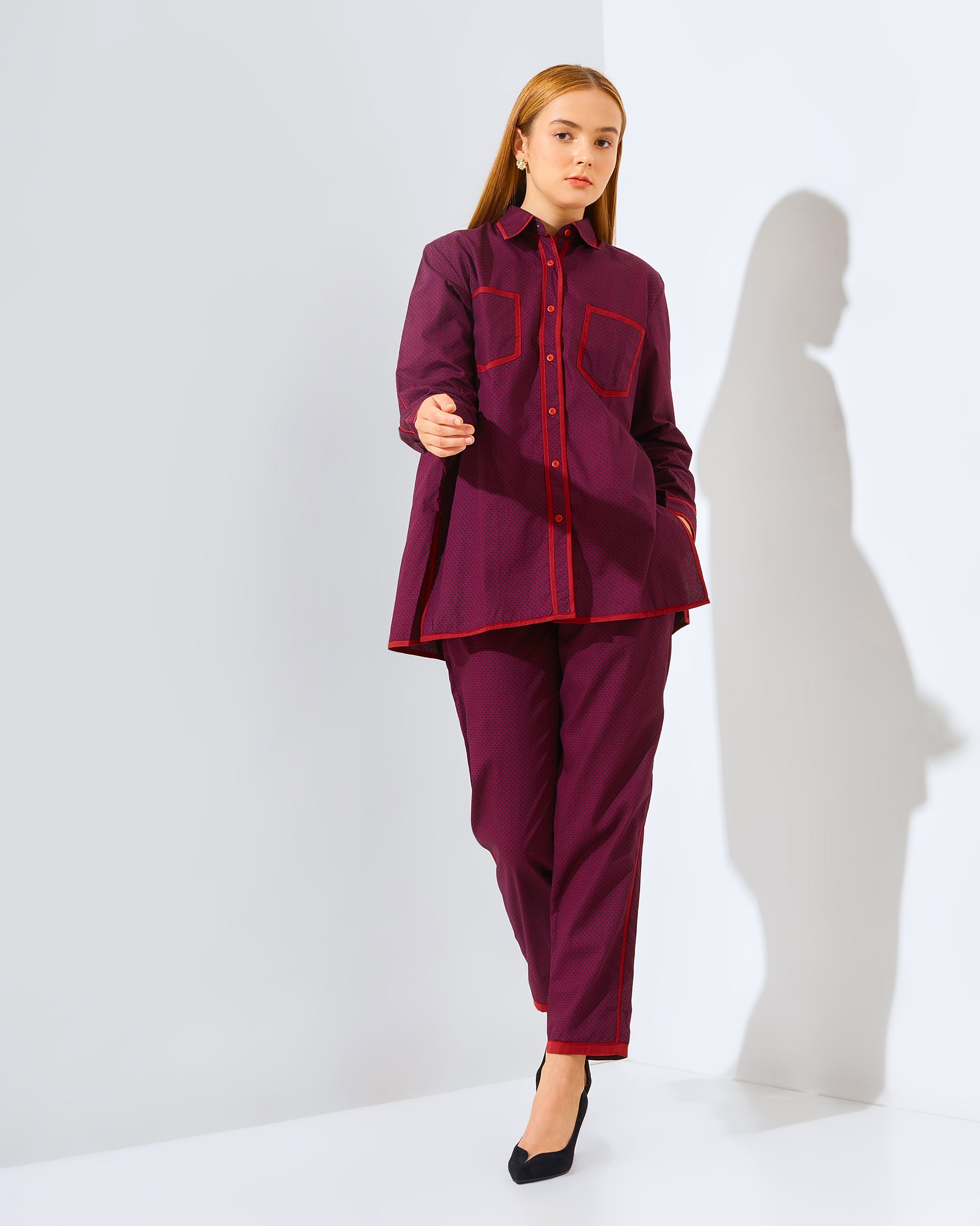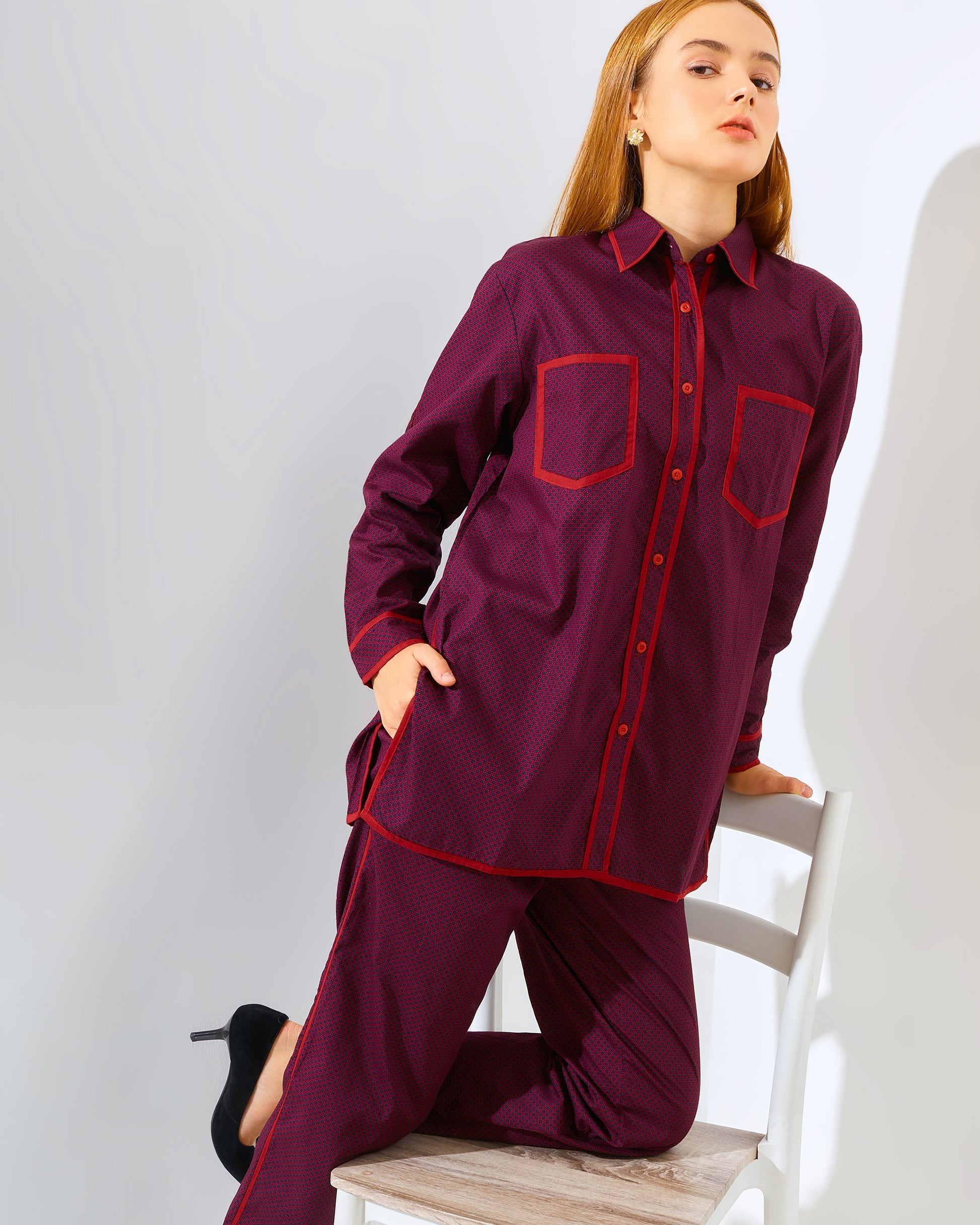 Introducing the stunning Vivie Matching set in Black- Maroon ! Elevate your style with this exquisite set, designed to make a lasting impression. Crafted from premium Poplin Cotton Stretch, it offers unrivaled comfort and luxurious quality. beautifully complemented by sleek black piping details on both the top and pants. Perfectly tailored, this set exudes sophistication and elegance, making it an ideal choice for any occasion. Step into the spotlight and showcase your impeccable taste with the Vivie Matching Top Black- Maroon. Experience fashion at its finest. Order yours today!